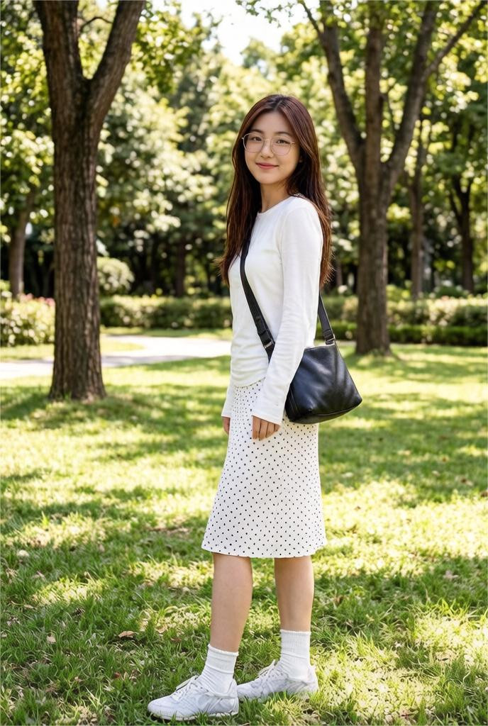 修身单品不会紧贴身体,运用空间感增多透气性和搭配的纯真性,单品也不会太过宽松,让东说念主以为随性有度,大方多礼,白色漂浮款打底衫搭配白色波点直筒裙就值得模仿。