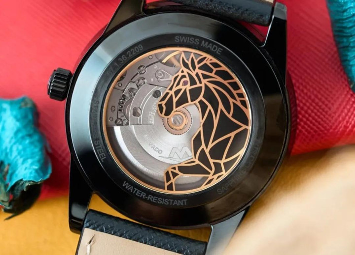 行为马年稀罕款,这枚表的 “马” 元素在正面亦然颇为克制:泰格豪雅把日期的数字 “7” 作念成了红底 “马” 字,另外便是表背透玻璃上印了个赛马图案。
