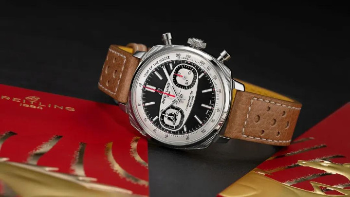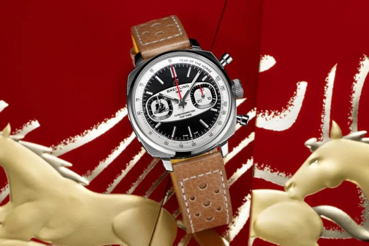 那行为马年限量款,百年灵为它作念了些什么变化呢?9 点位子盘中多印了一个马头,小时刻度尖端的叶光点作念成了红色,表背底盖作念了个马头镌刻。