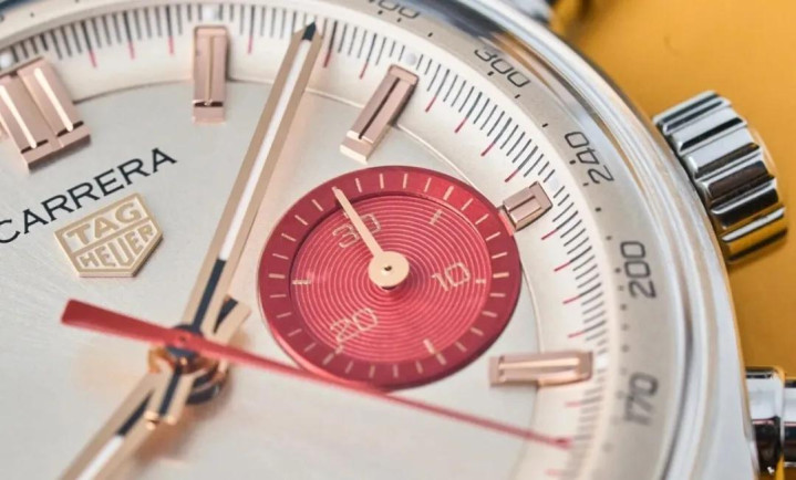 这枚马年稀罕款,第一时辰看其实很容易给东说念主留住深远印象。行为一款计时码表,却唯有一个子盘,9 点位日期的盘面布局式样就还是绝顶稀罕,再搭配扫数淡香槟金色的盘面和红里微微带少许粉的神色,新奇 + 新奇的组合详情绝顶能捏东说念主眼球。