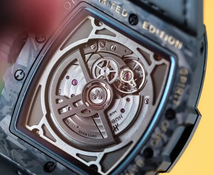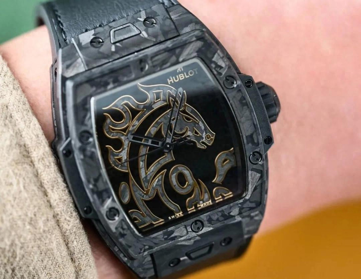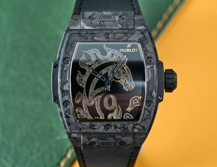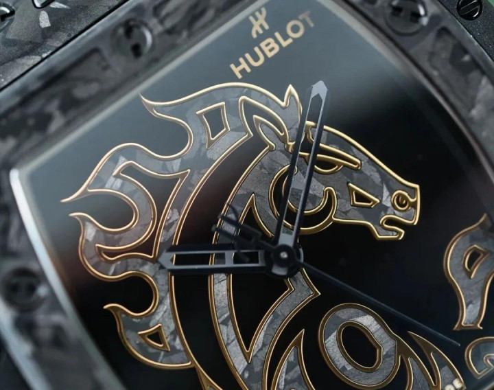 全黑的表壳和表带,表壳是 42 毫米的碳纤维酒桶形表壳,表盘中金色的马图形盘算推算灵感外传是源自唐代的艺术作品,用的是碳纤维细工嵌入工艺,手工铺叠的镀金黄铜贴片。机芯是 HUB1710 高性能自动上链机械机芯。限量唯有 88 枚,售价东说念主民币 293,100 元。