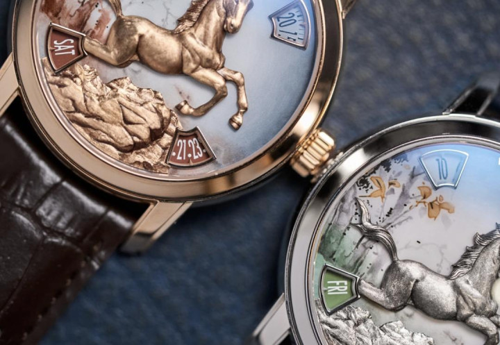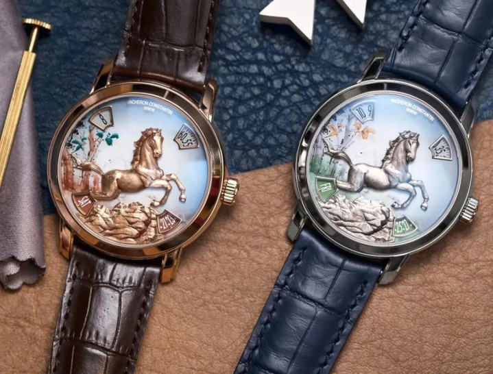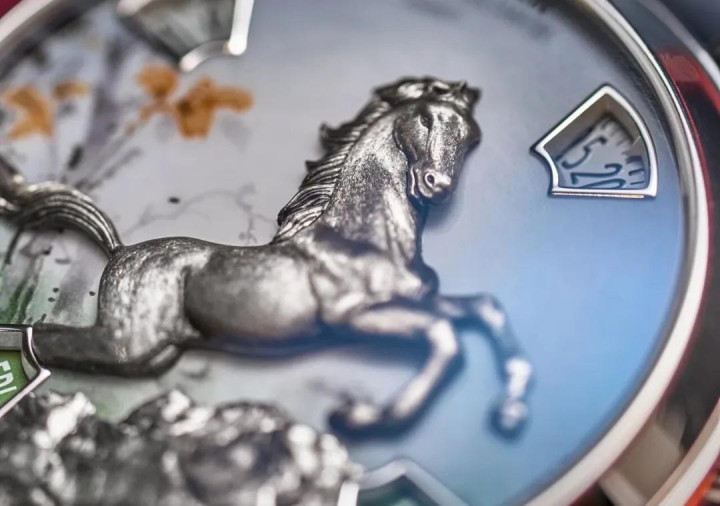本年相似给与了两种表壳材质,搭配了两种色彩,用江诗丹顿最顶级的微雕工艺,展现出最具立体感、亦然最写实的驱驰中的骏马造型。