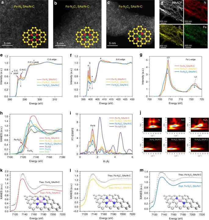 图4:Fe–Nx单原子位点:Fe K-edge XANES、FT-EXAFS与WT-EXAFS空洞表征。DOI:10.1038/s41467-019-12362-8