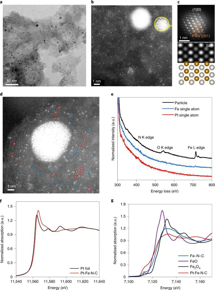 图6:Pt与Fe单原子/合金纳米结构共存体系:Pt L3、Fe K边XANES对比。DOI:10.1038/s41929-022-00796-1