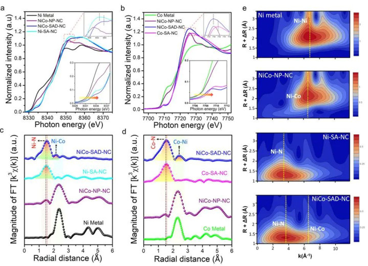 图7:Ni-Co单原子二聚位点:Ni/Co K-edge XANES、FT-EXAFS及WT-EXAFS。DOI:10.1038/s41467-021-27145-3