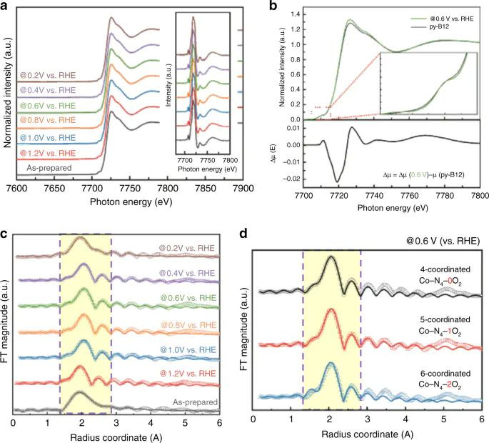 图5:Operando Co K-edge:不同偏压下的XANES、Δμ-XANES与FT-EXAFS及模子拟合。DOI:10.1038/s41467-020-17975-y
